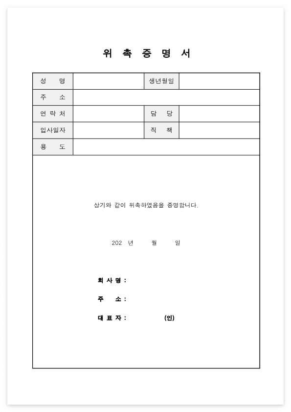위촉증명서는 상시 고용이 아닌 프리랜서들의 재직증명서 일종이다. 특히나 워라벨을 중시하는 시대 분위기에 힘입어 꼭 풀타임으로, 정규직으로 일하기를 원치 않고 파트타임 혹은 자기 전문분야를 살려 일감을 받아내는 프리랜서들이 많아지는 만큼 이 위촉증명서를 사용하면 된다. 4대보험은 가입이 안되어 있어도 근로중이라는 증빙을 해야하는 상황이 많고, 특히 아이 돌봄같은 교육을 신청하기 위해 맞벌이를 증빙해야하는 근로자들의 필수 양식이다.