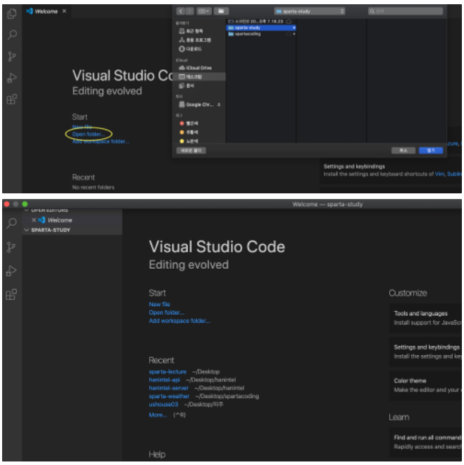폴더 열기를 누른 후 바탕화면의 위 폴더를 연다