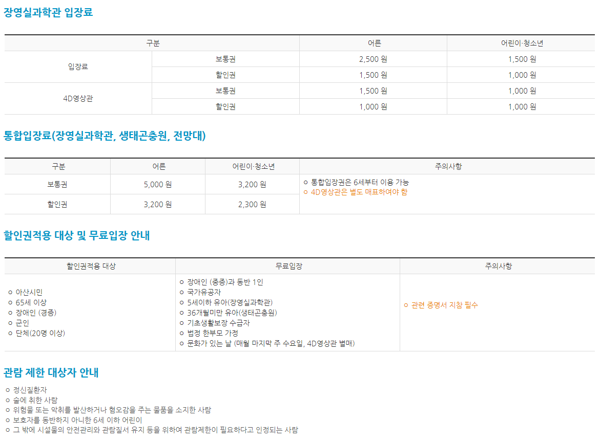 무료입장도 있고, 이곳의 장점은 장영실과학관 옆에 생태체험관과 전망대가 있어서 통합이용권으로 이용하시면 성인 기준 5,000원에 모두 입장관람이 가능합니다.
